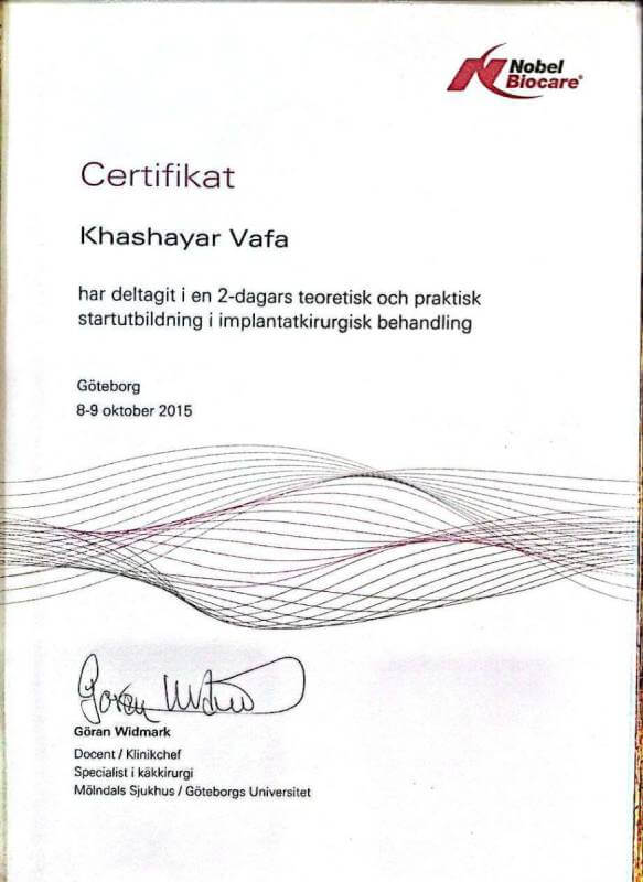 گواهی شرکت در دوره ۲ روزه تئوری و عملی پروتز ایمپلنت (Brånemark System)، ارائه‌شده توسط نوبل بایوکر به خشایار وفا در استکهلم، سپتامبر ۲۰۱۵.